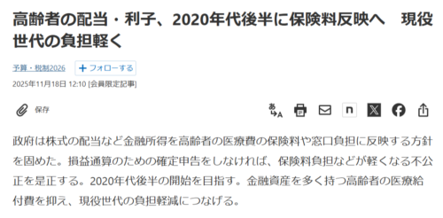 高齢者の配当・利子、2020年代後半に保険料反映へ 現役世代の負担軽く – 日本経済新聞