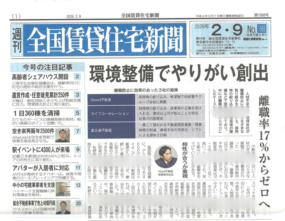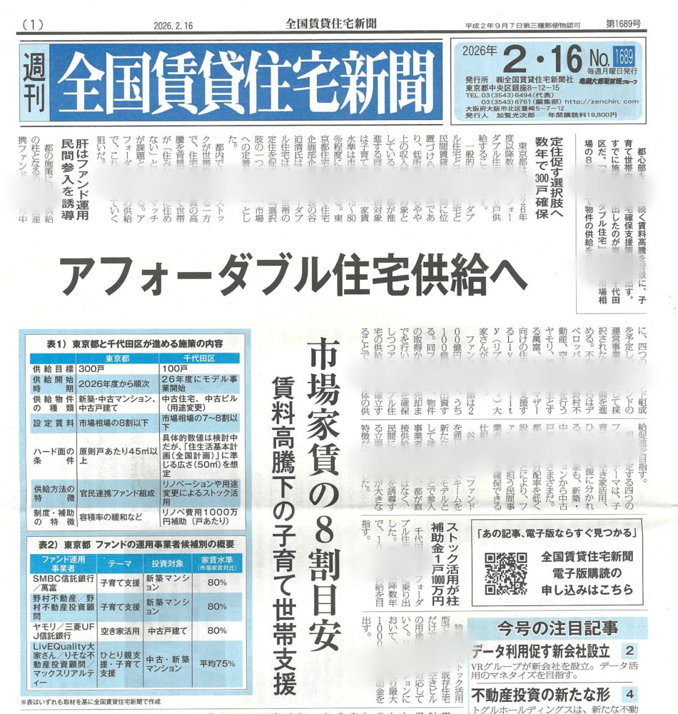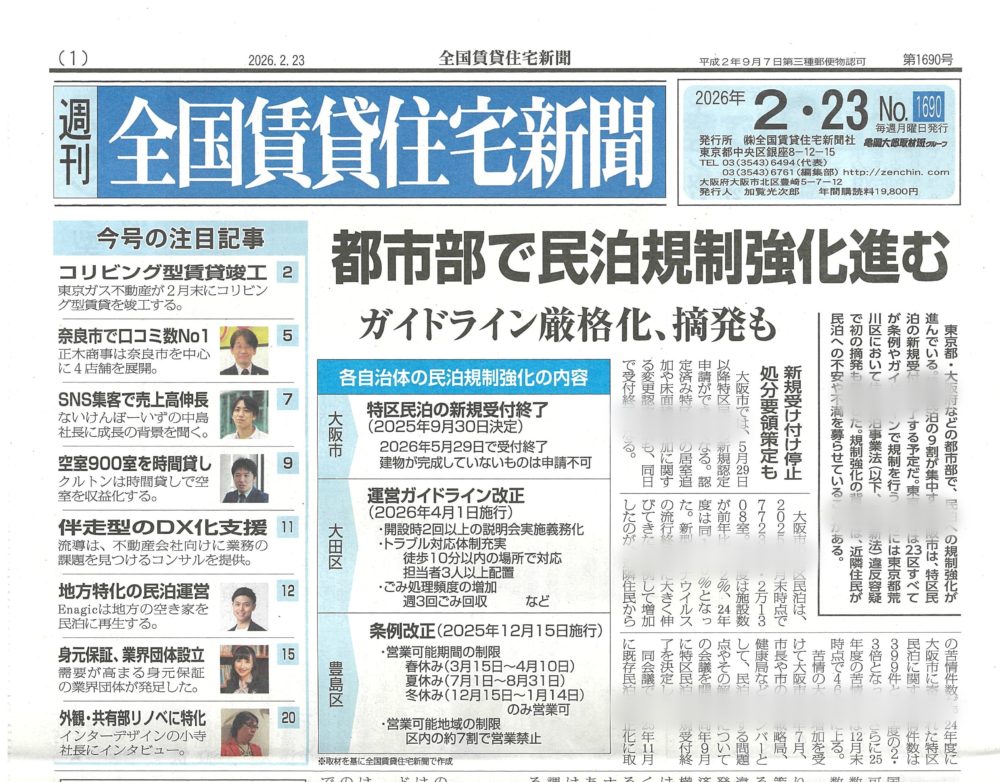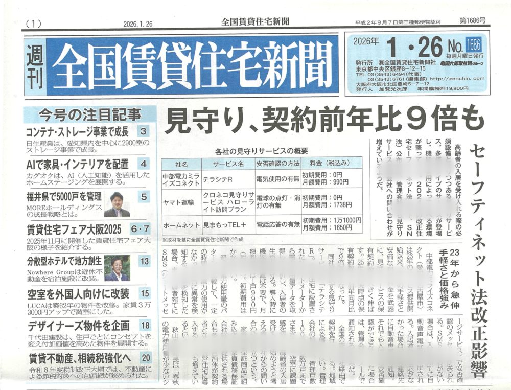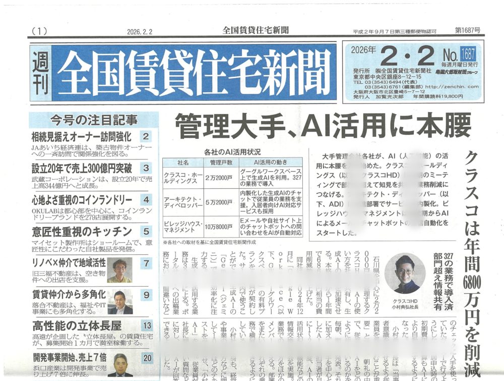 賃貸住宅新聞 これから広がる「見守りサービス」について by 全国賃貸住宅新聞 ~毎日… 2026.01.30 賃貸住宅新聞 これから広がる「見守りサービス」について by 全国賃貸住宅… 賃貸住宅新聞 | 2026.01.30 大家自身で入居者募集をしていこう! by 全国賃貸住宅新聞 ~毎日ブログ… 2026.01.28 賃貸住宅新聞 大家自身で入居者募集をしていこう! by 全国賃貸住宅新聞 … 賃貸住宅新聞 | 2026.01.28 人生が大きく変わる理由について by 全国賃貸住宅新聞 ~毎日ブログ18… 2026.01.18 賃貸住宅新聞 人生が大きく変わる理由について by 全国賃貸住宅新聞 ~毎… 賃貸住宅新聞 | 2026.01.18 ランキングを気にする必要はありません。by 全国賃貸住宅新聞 ~ 毎日ブ… 2026.01.10 賃貸住宅新聞 ランキングを気にする必要はありません。by 全国賃貸住宅新聞… 賃貸住宅新聞 | 2026.01.10 住宅確保要配慮者の仕組に大家も関わろう! by 全国賃貸住宅新聞 ~毎日… 2026.01.02 賃貸住宅新聞 住宅確保要配慮者の仕組に大家も関わろう! by 全国賃貸住宅… 賃貸住宅新聞 | 2026.01.02 減給降格が喜べるサラリーマンを目指そう! by 全国賃貸住宅新聞 ~毎日… 2025.12.27 賃貸住宅新聞 減給降格が喜べるサラリーマンを目指そう! by 全国賃貸住宅… 賃貸住宅新聞 | 2025.12.27 僕もAI活用していきます!AI分マン横ちゃんをよろしく(笑) by 全国… 2025.12.17 賃貸住宅新聞 僕もAI活用していきます!AI分マン横ちゃんをよろしく(笑)… 賃貸住宅新聞 | 2025.12.17 長持ちする建物とは? by 全国賃貸住宅新聞 ~1861日目 2025.12.11 賃貸住宅新聞 長持ちする建物とは? by 全国賃貸住宅新聞 ~1861日目 賃貸住宅新聞 | 2025.12.11 要配慮者の「一人暮らしの夢」を叶えよう! by 全国賃貸住宅新聞 ~毎日… 2025.12.03 賃貸住宅新聞 要配慮者の「一人暮らしの夢」を叶えよう! by 全国賃貸住宅… 賃貸住宅新聞 | 2025.12.03 認知度アップを意識しよう! by 全国賃貸住宅新聞 ~毎日ブログ1849… 2025.11.29 賃貸住宅新聞 認知度アップを意識しよう! by 全国賃貸住宅新聞 ~毎日ブ… 賃貸住宅新聞 | 2025.11.29 これからの賃貸ビジネスの方向性 by 全国賃貸住宅新聞 ~毎日ブログ18… 2025.11.23 賃貸住宅新聞 これからの賃貸ビジネスの方向性 by 全国賃貸住宅新聞 ~毎… 賃貸住宅新聞 | 2025.11.23 民泊の基準がわかった! by 全国賃貸住宅新聞 ~毎日ブログ1832日目 2025.11.14 賃貸住宅新聞 民泊の基準がわかった! by 全国賃貸住宅新聞 ~毎日ブログ… 賃貸住宅新聞 | 2025.11.14 「AI分マン横ちゃん」が登場?! by 全国賃貸住宅新聞 ~毎日ブログ1… 2025.11.06 賃貸住宅新聞 「AI分マン横ちゃん」が登場?! by 全国賃貸住宅新聞 ~… 賃貸住宅新聞 | 2025.11.06 宅配ボックスは賃貸ではまだ少数? by 全国賃貸住宅新聞 ~毎日ブログ1… 2025.11.02 賃貸住宅新聞 宅配ボックスは賃貸ではまだ少数? by 全国賃貸住宅新聞 ~… 賃貸住宅新聞 | 2025.11.02 再現できる投資をしよう! by 全国賃貸住宅新聞 ~毎日ブログ1810日… 2025.10.21 賃貸住宅新聞 再現できる投資をしよう! by 全国賃貸住宅新聞 ~毎日ブロ… 賃貸住宅新聞 | 2025.10.21 「分マン大家になる!」と決意したのは東日本大震災でした。by 全国賃貸住… 2025.10.14 賃貸住宅新聞 「分マン大家になる!」と決意したのは東日本大震災でした。by… 賃貸住宅新聞 | 2025.10.14 生成AIががすごいぞ! by 全国賃貸住宅新聞 ~毎日ブログ1787日目 2025.09.28 賃貸住宅新聞 生成AIががすごいぞ! by 全国賃貸住宅新聞 ~毎日ブログ… 賃貸住宅新聞 | 2025.09.28 自分で経営しない人が多い業界の賃貸業 by 全国賃貸住宅新聞 ~毎日ブロ… 2025.09.21 賃貸住宅新聞 自分で経営しない人が多い業界の賃貸業 by 全国賃貸住宅新聞… 賃貸住宅新聞 | 2025.09.21 高齢者に優しい分譲マンションで賃貸経営を! by 全国賃貸住宅新聞 ~毎… 2025.09.11 賃貸住宅新聞 高齢者に優しい分譲マンションで賃貸経営を! by 全国賃貸住… 賃貸住宅新聞 | 2025.09.11 不動産クラファンは応援か? by 全国賃貸住宅新聞 ~毎日ブログ1765… 2025.09.06 賃貸住宅新聞 不動産クラファンは応援か? by 全国賃貸住宅新聞 ~毎日ブ… 賃貸住宅新聞 | 2025.09.06 空き家をチャンスに! by 全国賃貸住宅新聞 ~毎日ブログ1756日目 2025.08.28 賃貸住宅新聞 空き家をチャンスに! by 全国賃貸住宅新聞 ~毎日ブログ1… 賃貸住宅新聞 | 2025.08.28 マンスリー賃貸も始めてみよう! by 全国賃貸住宅新聞 ~毎日ブログ17… 2025.08.21 賃貸住宅新聞 マンスリー賃貸も始めてみよう! by 全国賃貸住宅新聞 ~毎… 賃貸住宅新聞 | 2025.08.21 住まいもデジタル化が進みます! by 全国賃貸住宅新聞 ~毎日ブログ17… 2025.08.19 賃貸住宅新聞 住まいもデジタル化が進みます! by 全国賃貸住宅新聞 ~毎… 賃貸住宅新聞 | 2025.08.19 副業するならストックビジネスで安定収入を! by 全国賃貸住宅新聞 ~毎… 2025.08.13 賃貸住宅新聞 副業するならストックビジネスで安定収入を! by 全国賃貸住… 賃貸住宅新聞 | 2025.08.13 フルローン融資がずっと続く理由とは? by 全国賃貸住宅新聞 ~毎日ブロ… 2025.08.06 賃貸住宅新聞 フルローン融資がずっと続く理由とは? by 全国賃貸住宅新聞… 賃貸住宅新聞 | 2025.08.06 「降格・減給・始末書」からの逆転劇! by 
